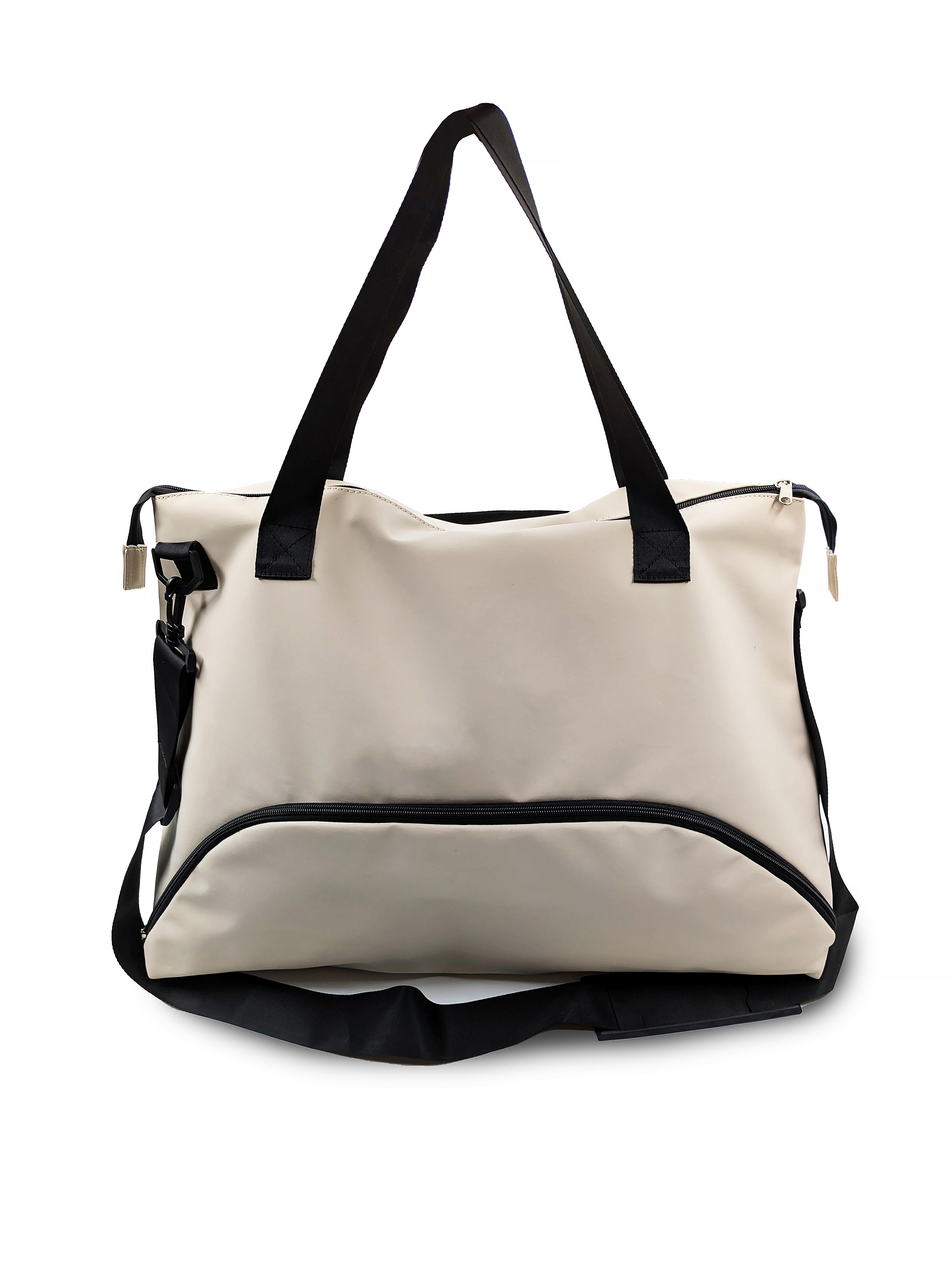 Maniglie e tracolla in colori in contrasto. Disponibile nelle colorazioni grigio/nero e avorio/nero.