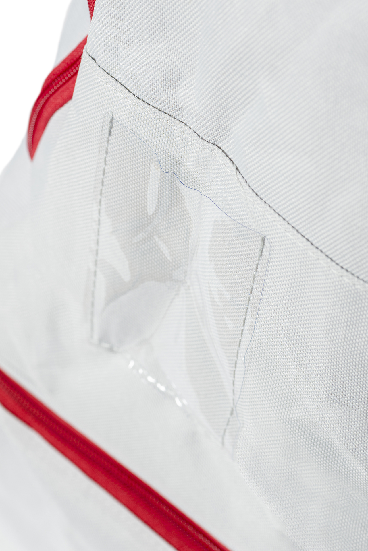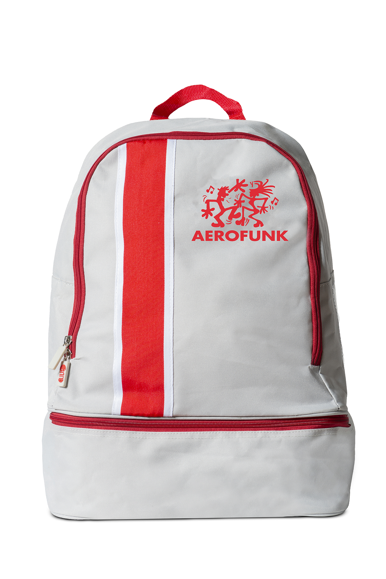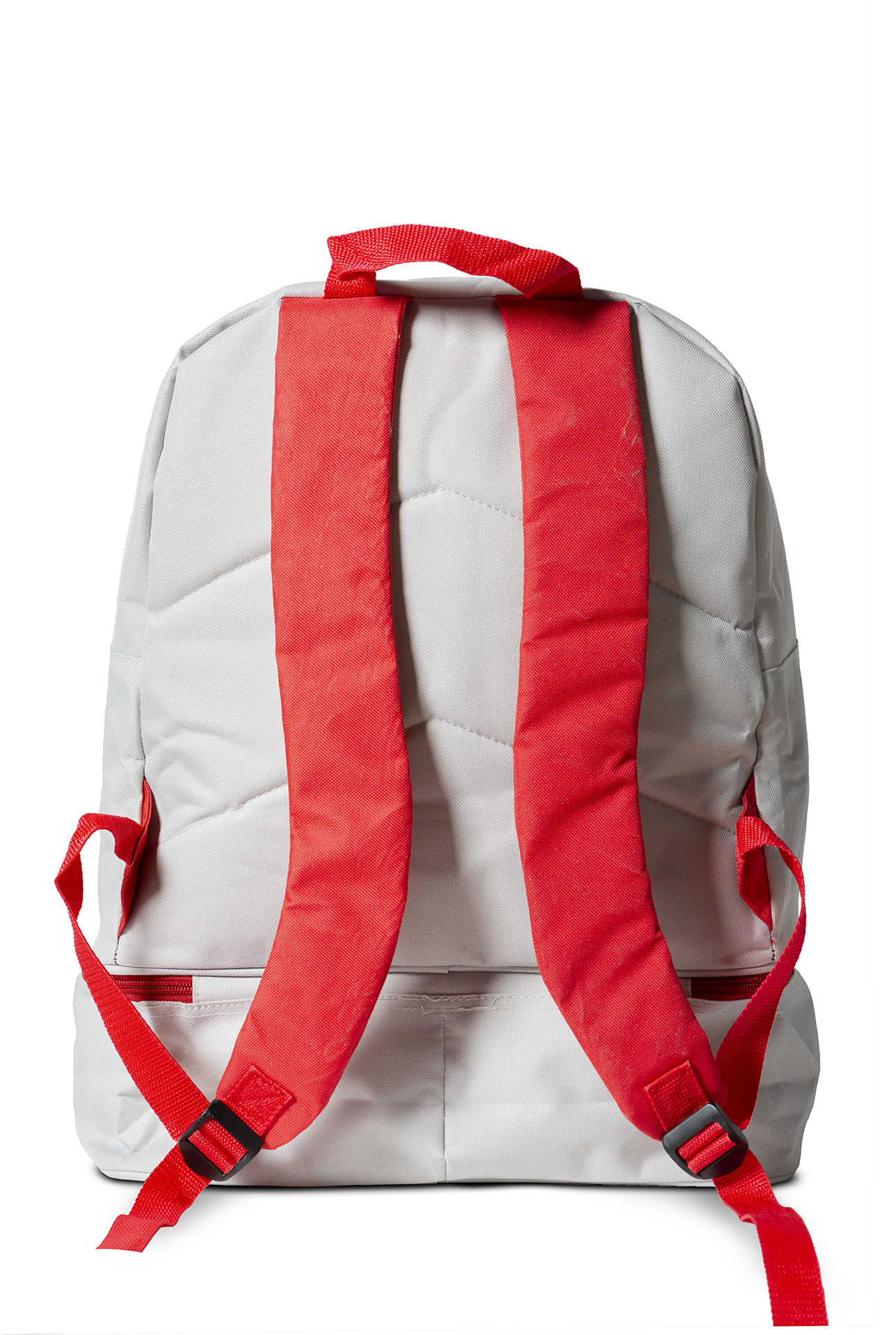 Zainetto con apertura frontale, spallacci rinforzati regolabili e maniglia, con portabadge laterale e fondo portascarpe.